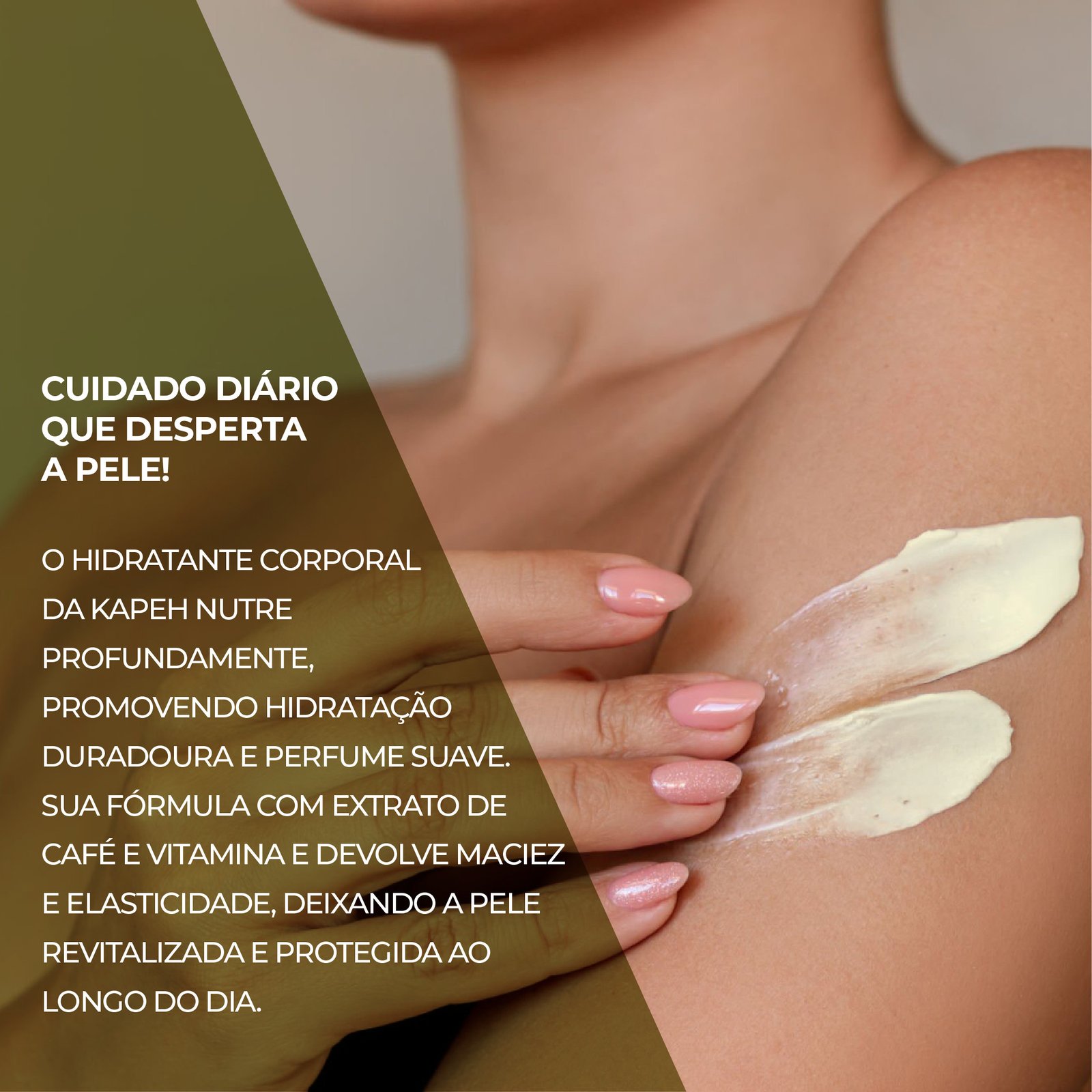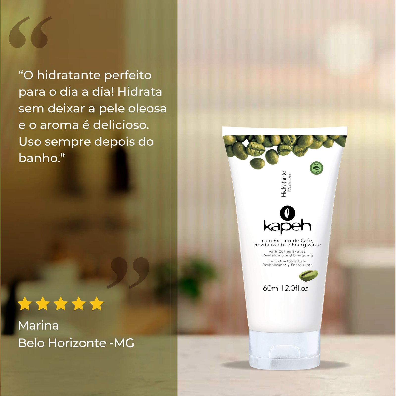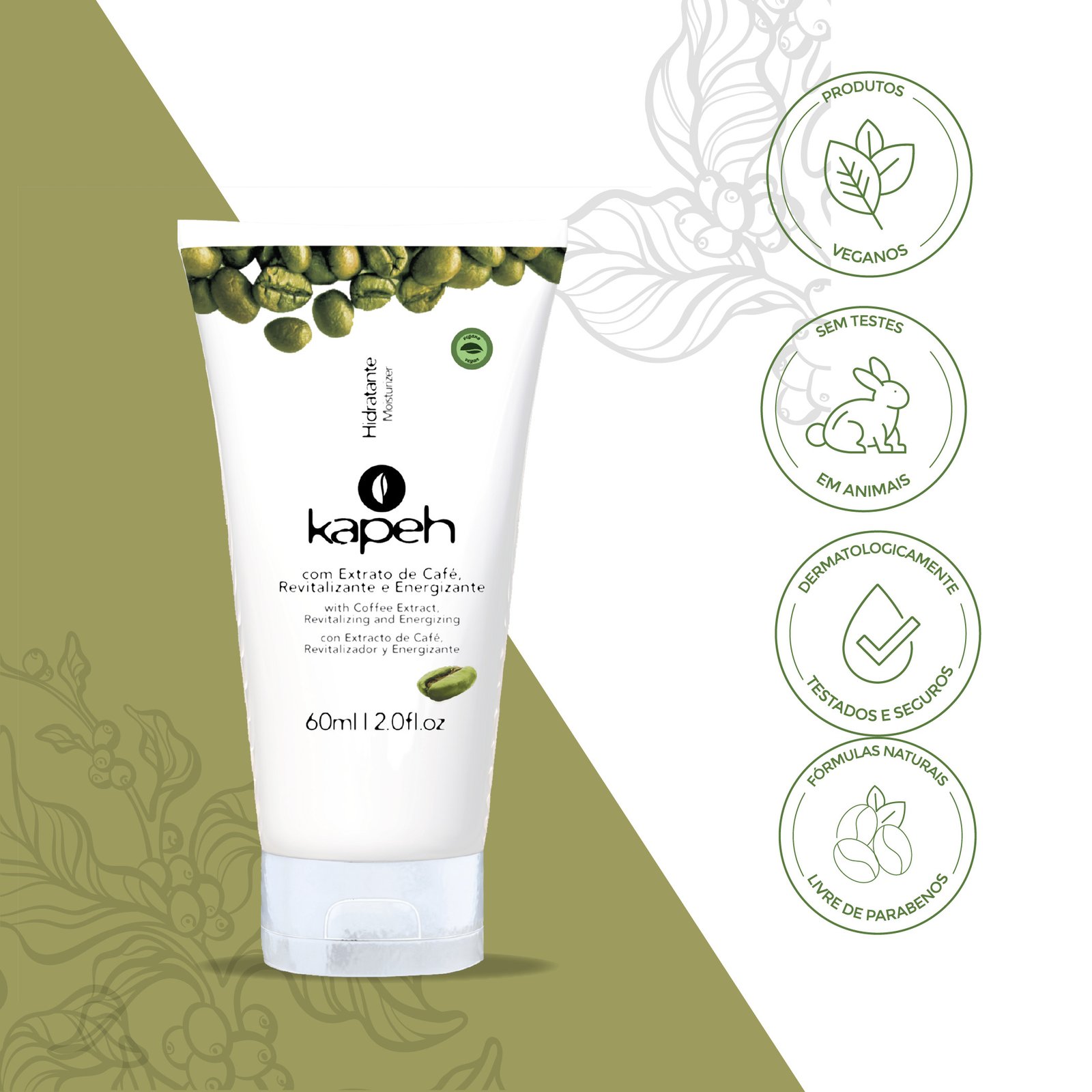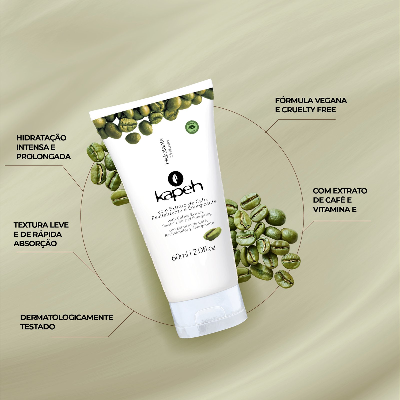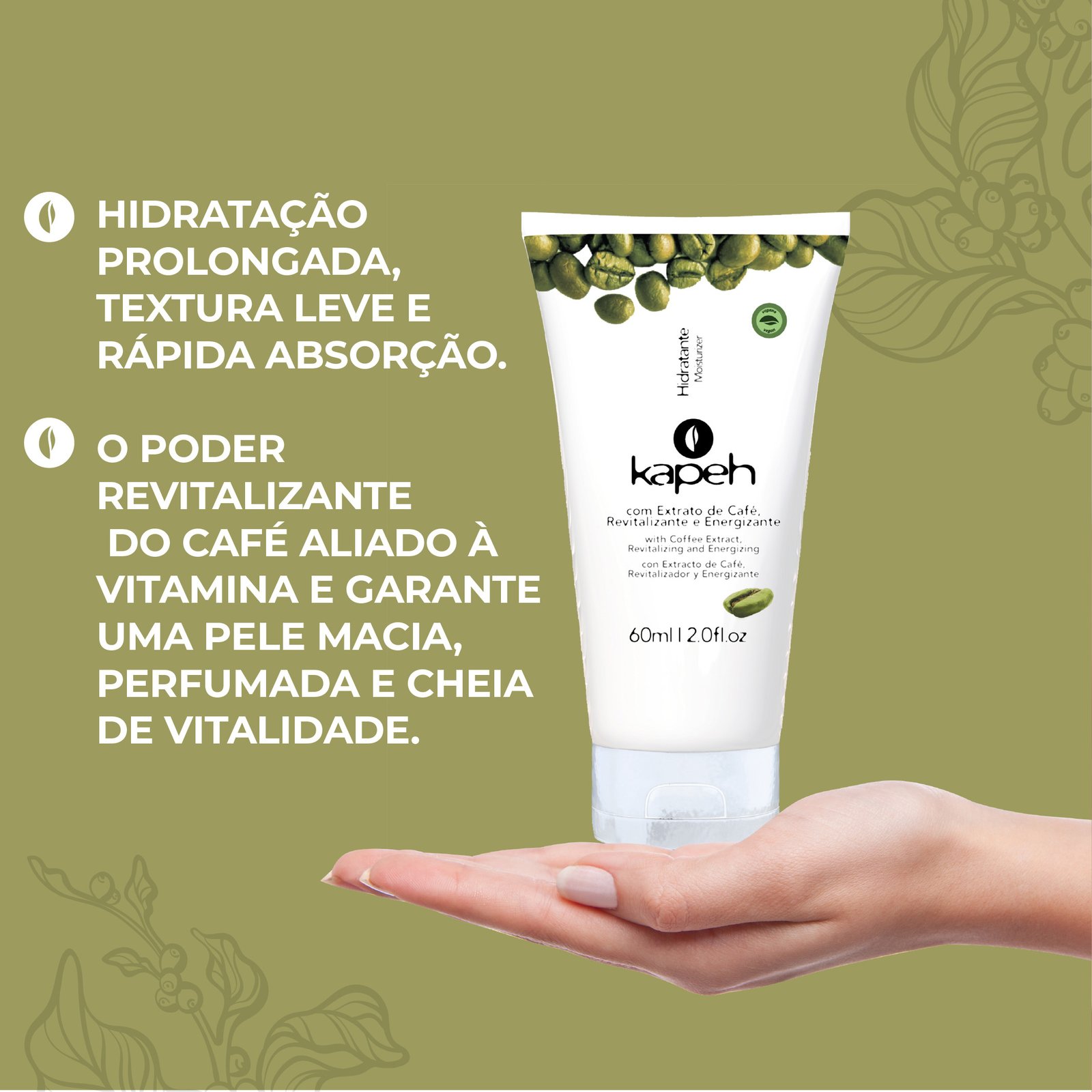 O Hidratante Kapeh alia as propriedades revitalizantes e energizantes do Extrato de Café aos efeitos hidratantes e emolientes da Vitamina E, possui textura leve e de rápida absorção que desodoriza a pele e oferece hidratação prolongada, proporcionando maciez e vitalidade durante todo o dia.