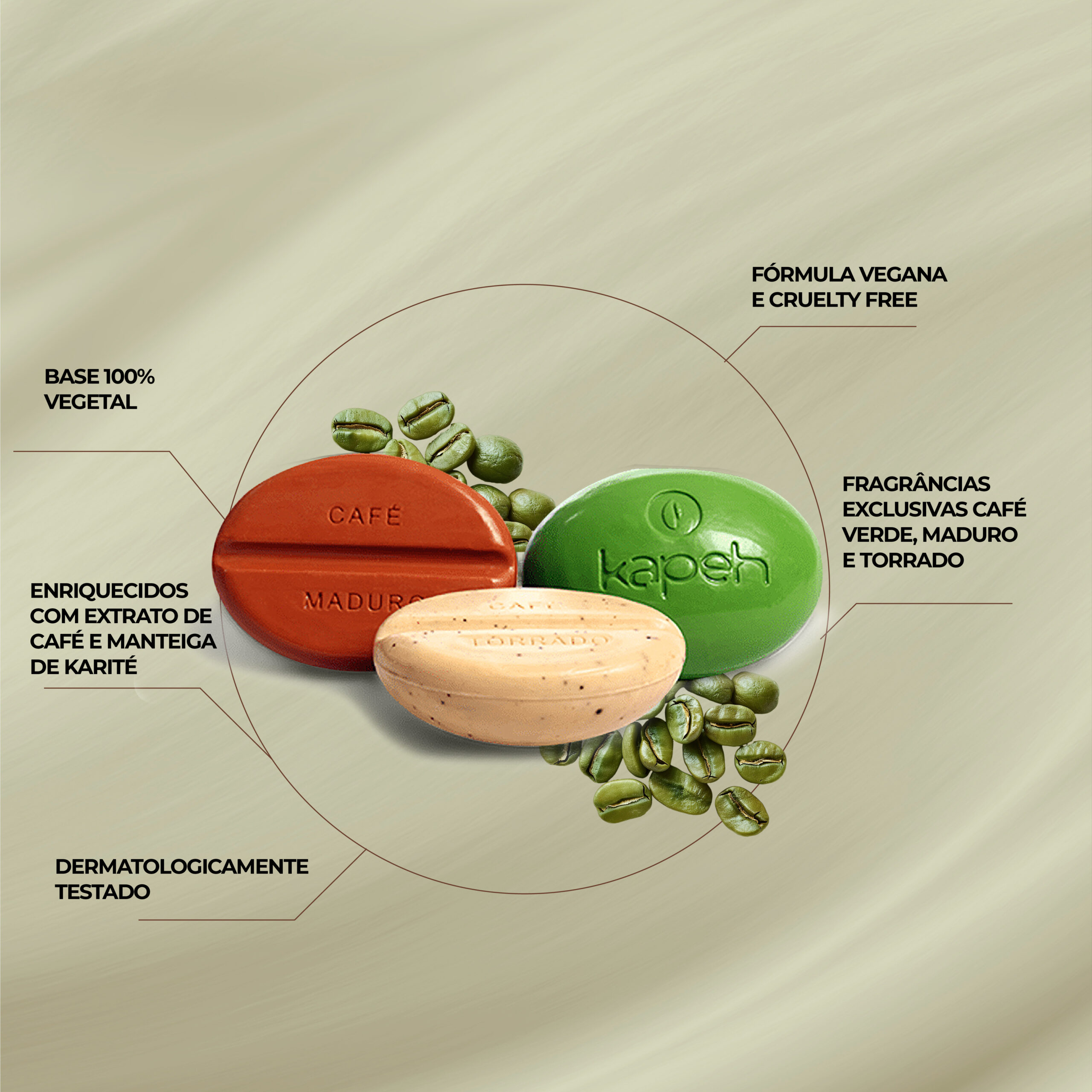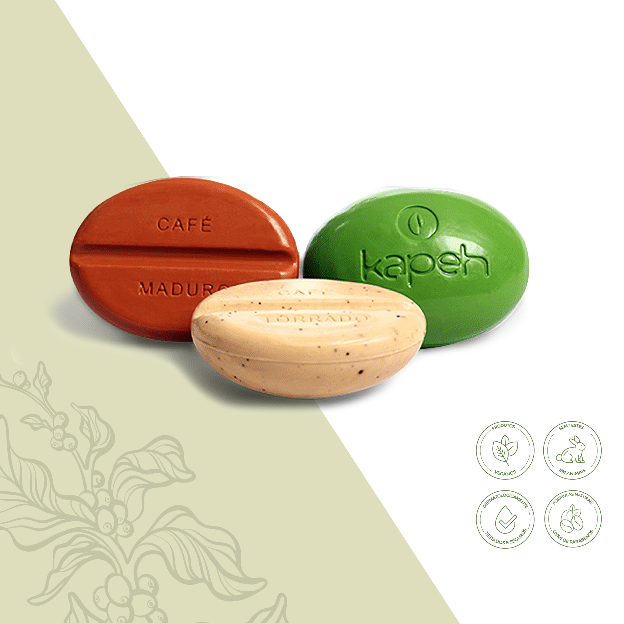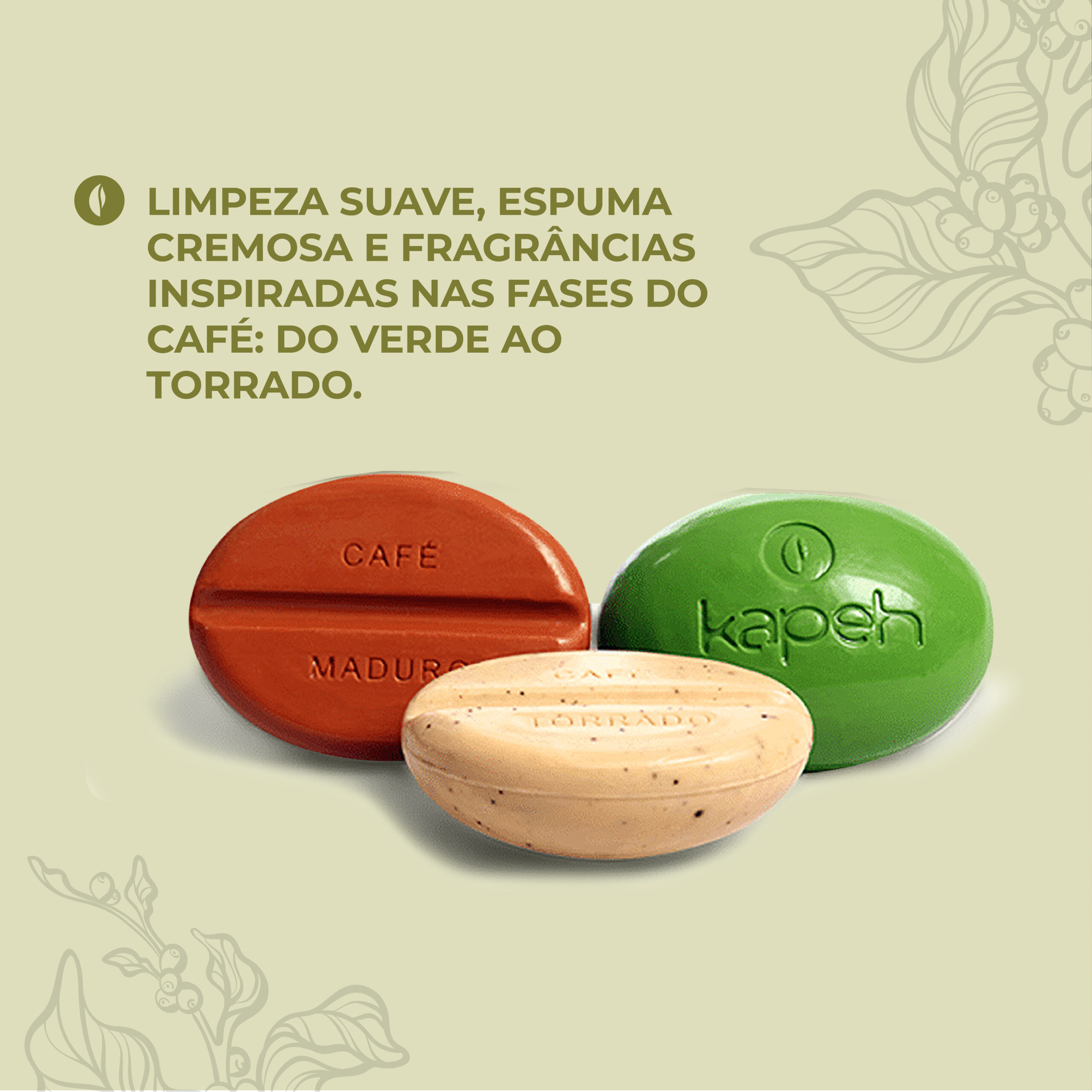 • Com novo formato: anatômico • Inspirado na forma do grão que dá origem a linha: o café Contém: 1 Sabonete 30g Café Verde Kapeh 1 Sabonete 30g Café Maduro Kapeh 1 Sabonete 30g Café Torrado Kapeh
