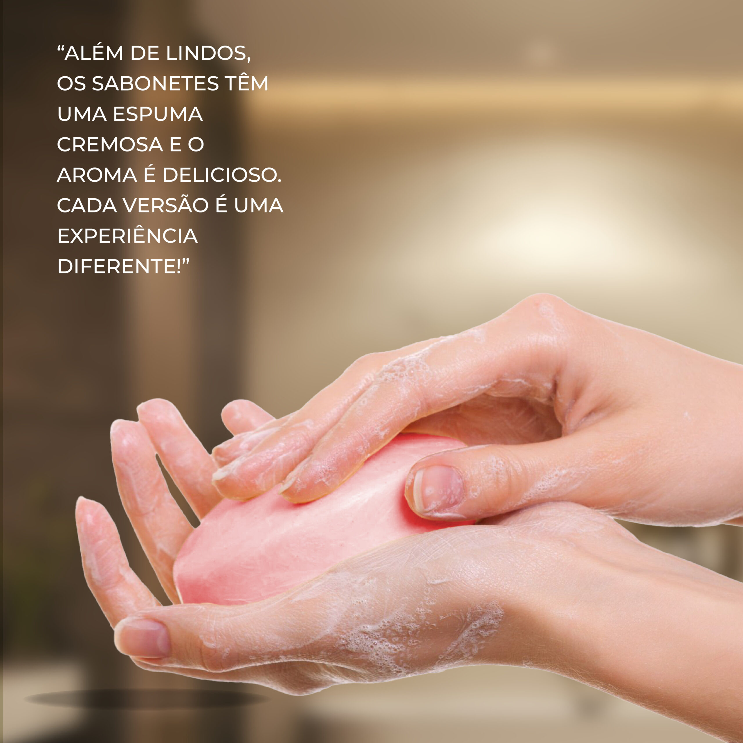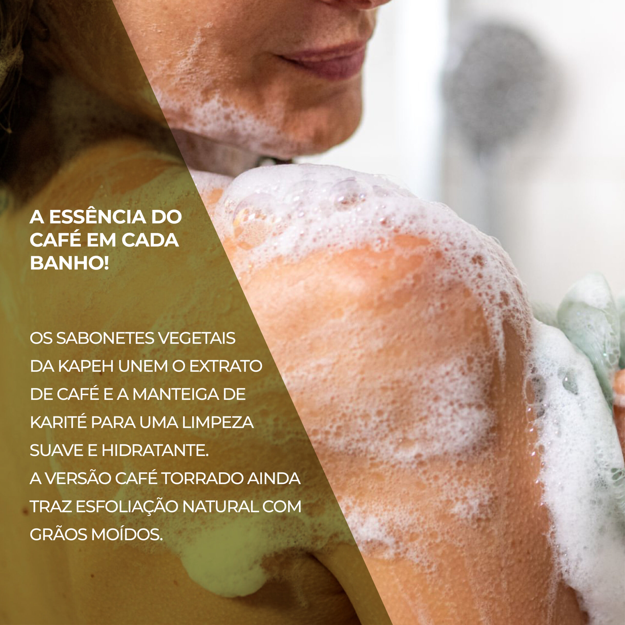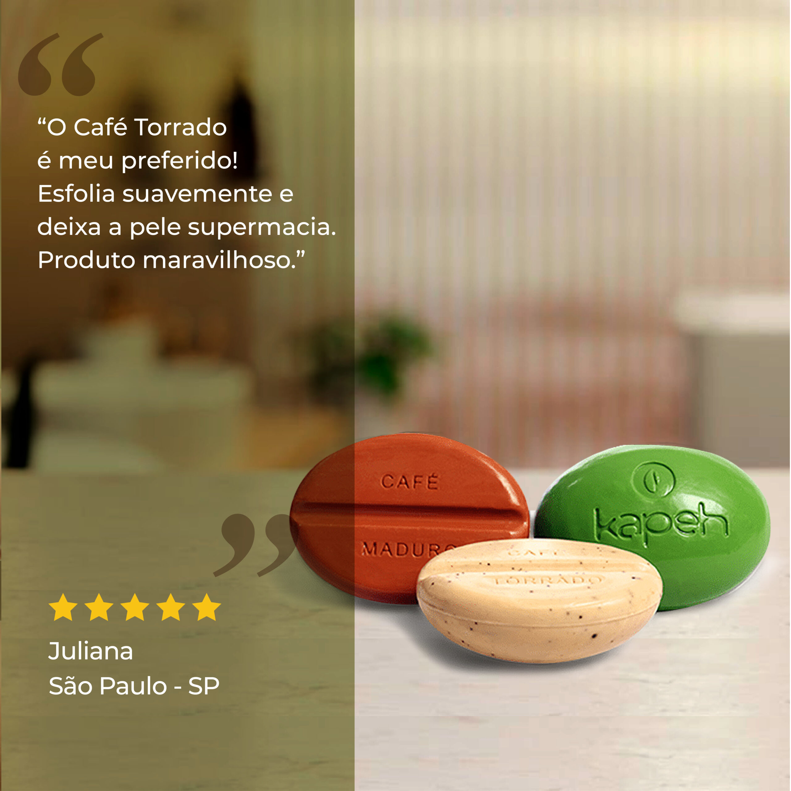 • Com novo formato: anatômico • Inspirado na forma do grão que dá origem a linha: o café Contém: 1 Sabonete 30g Café Verde Kapeh 1 Sabonete 30g Café Maduro Kapeh 1 Sabonete 30g Café Torrado Kapeh