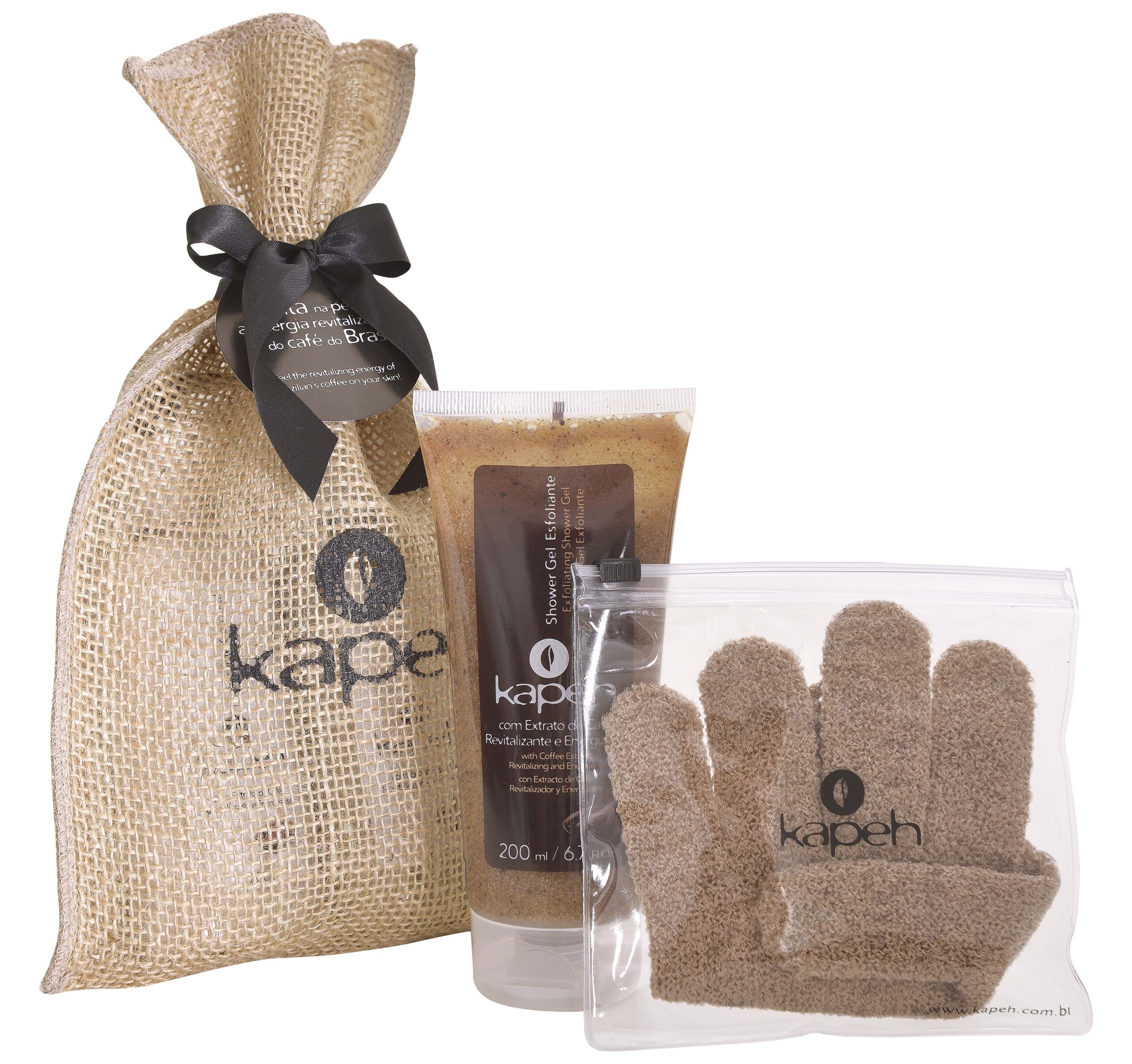 Embalagem de juta presenteável para a montagem de kits, com formato original e semelhante à maneira como são embalados os grãos de café, onde podem ser acondicionados de 2 a 3 produtos da linha. Apresenta fechamento superior com fita + tag preta com a mensagem: Sinta na pele toda a energia do café! |