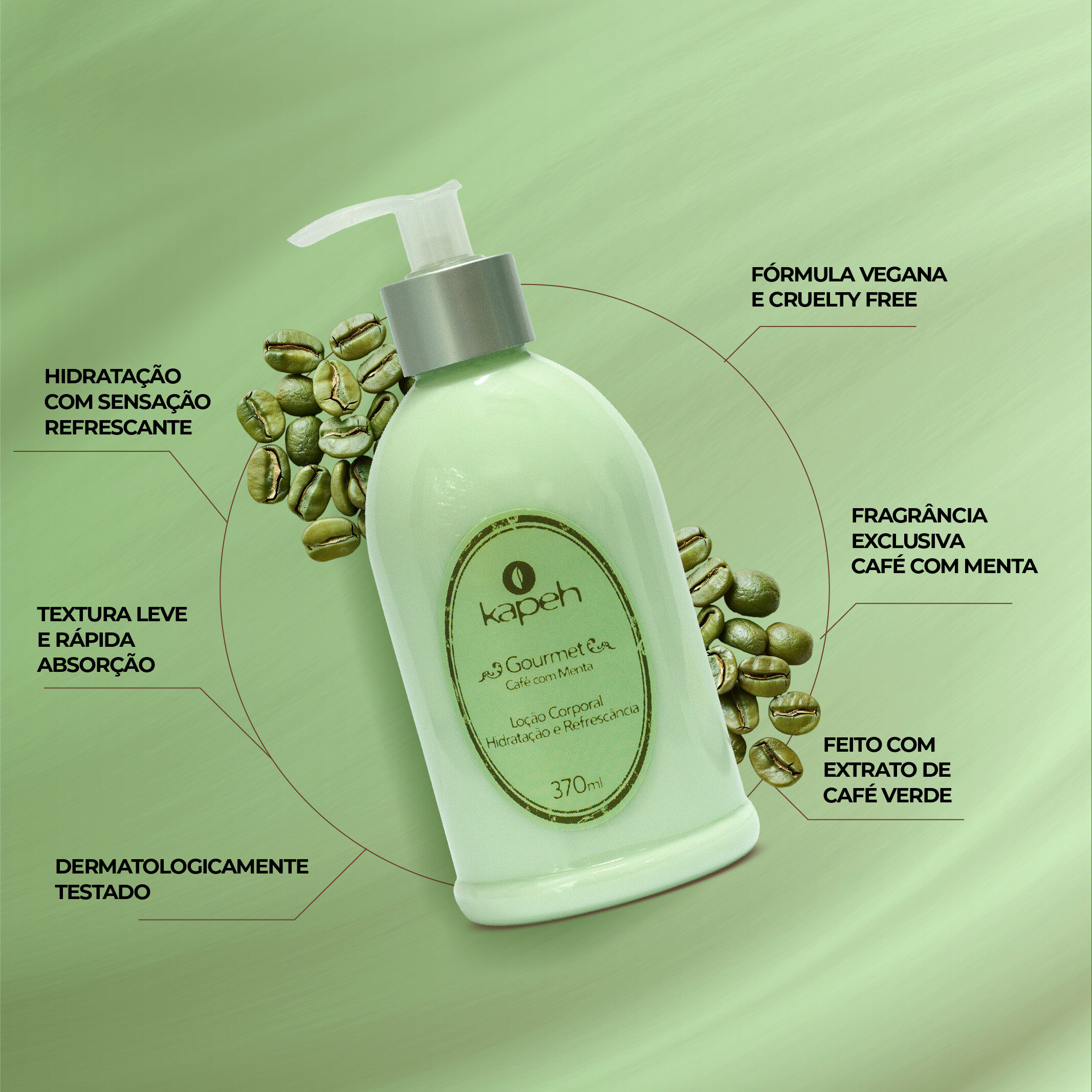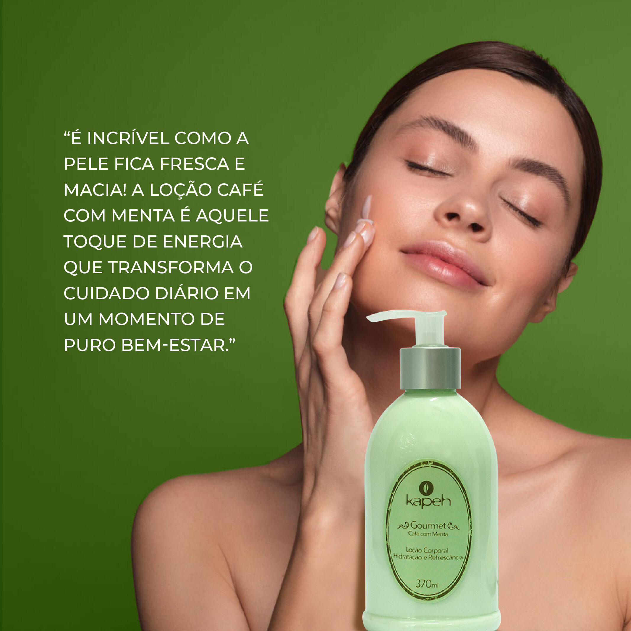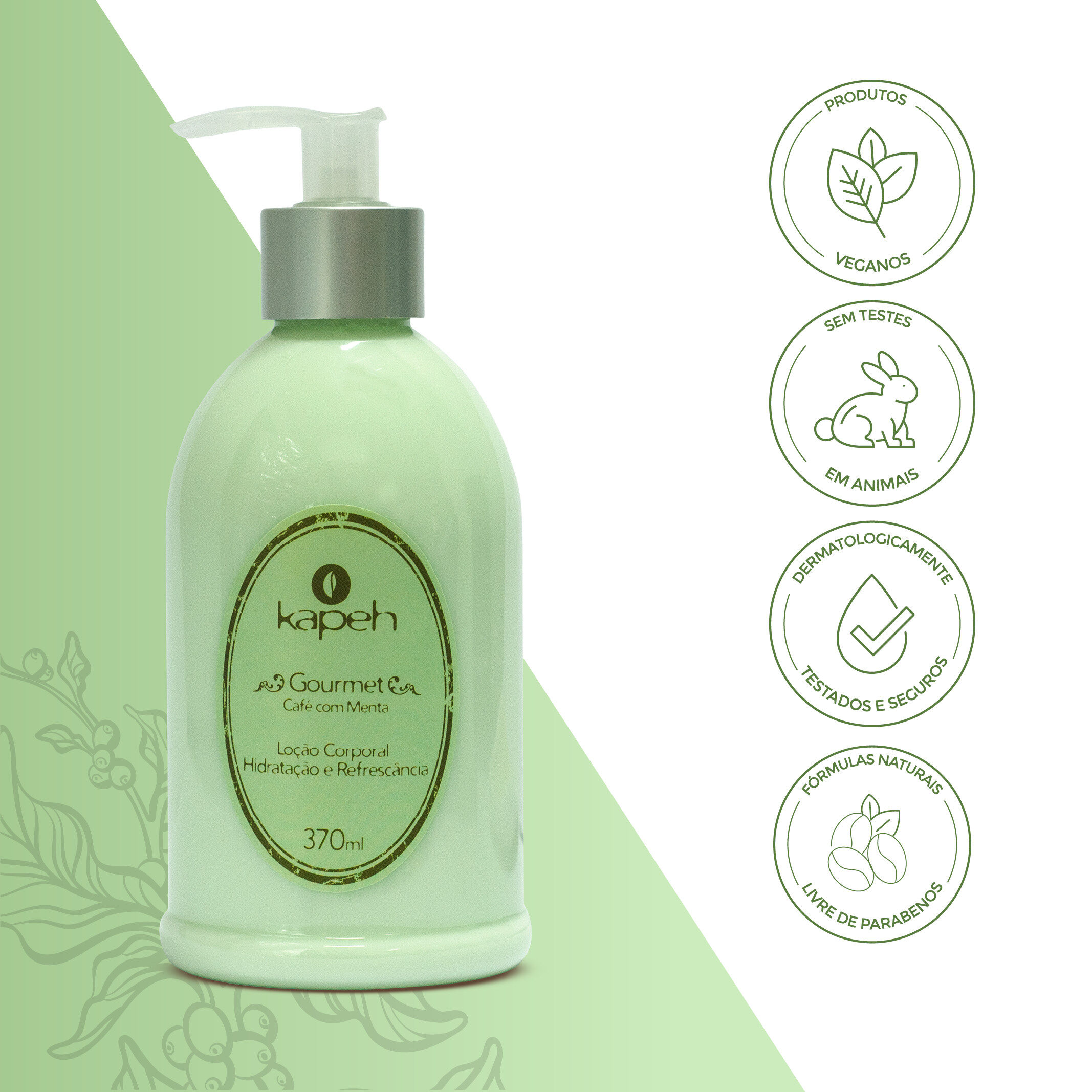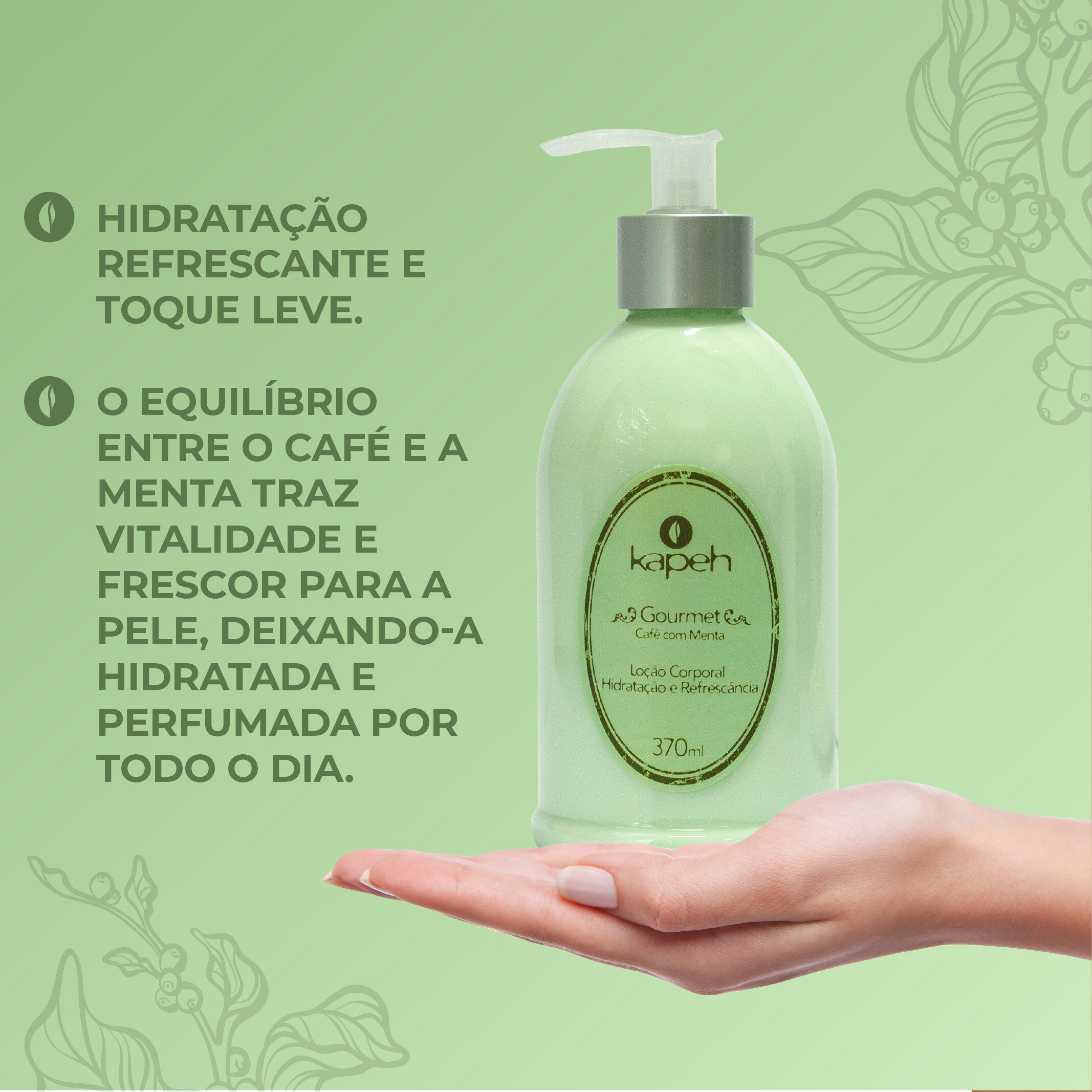 A Loção Hidratante Café com Menta possui fórmula especial feita à base de Extrato de Café Verde e enriquecida com Mentol que hidratam suavemente, desodorizam a pele e proporcionam sensação de frescor e bem-estar.