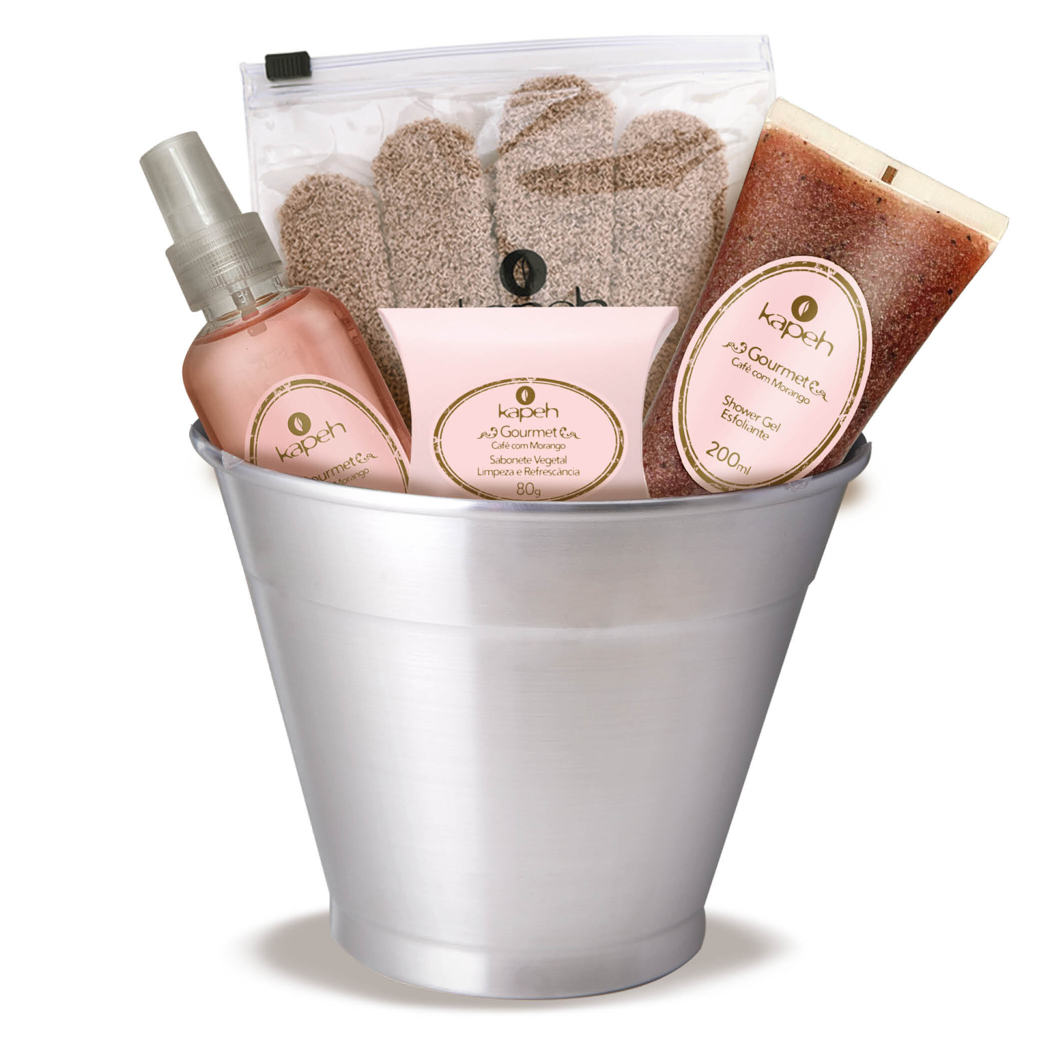 Balde em alumínio escovado para montagem de cestas com os produtos da Kapeh, onde podem ser acondicionados de 3 a 5 produtos da linha. Posteriormente pode ser usado também como cachepô. Acompanha papel celofane e fita para laço. |