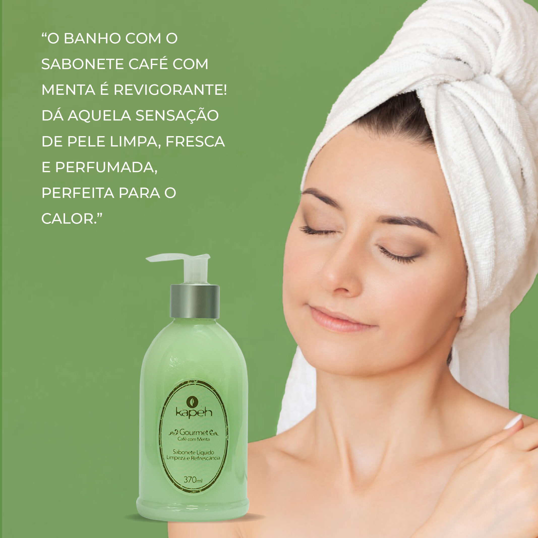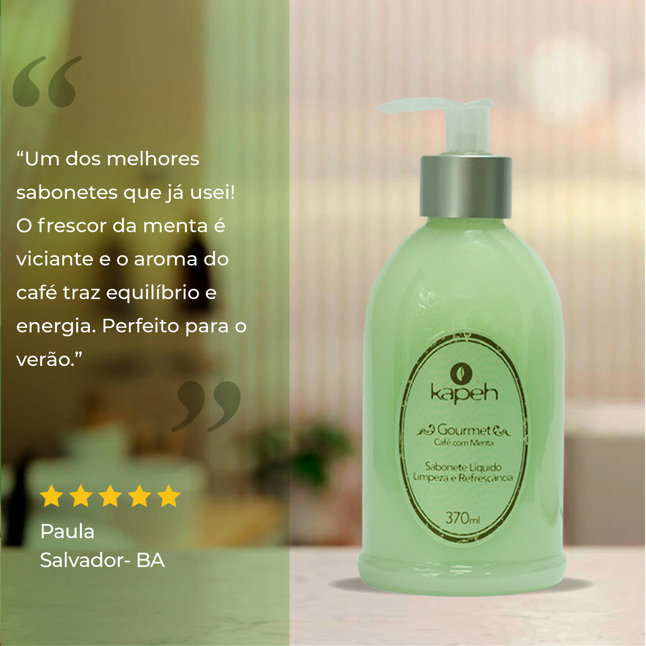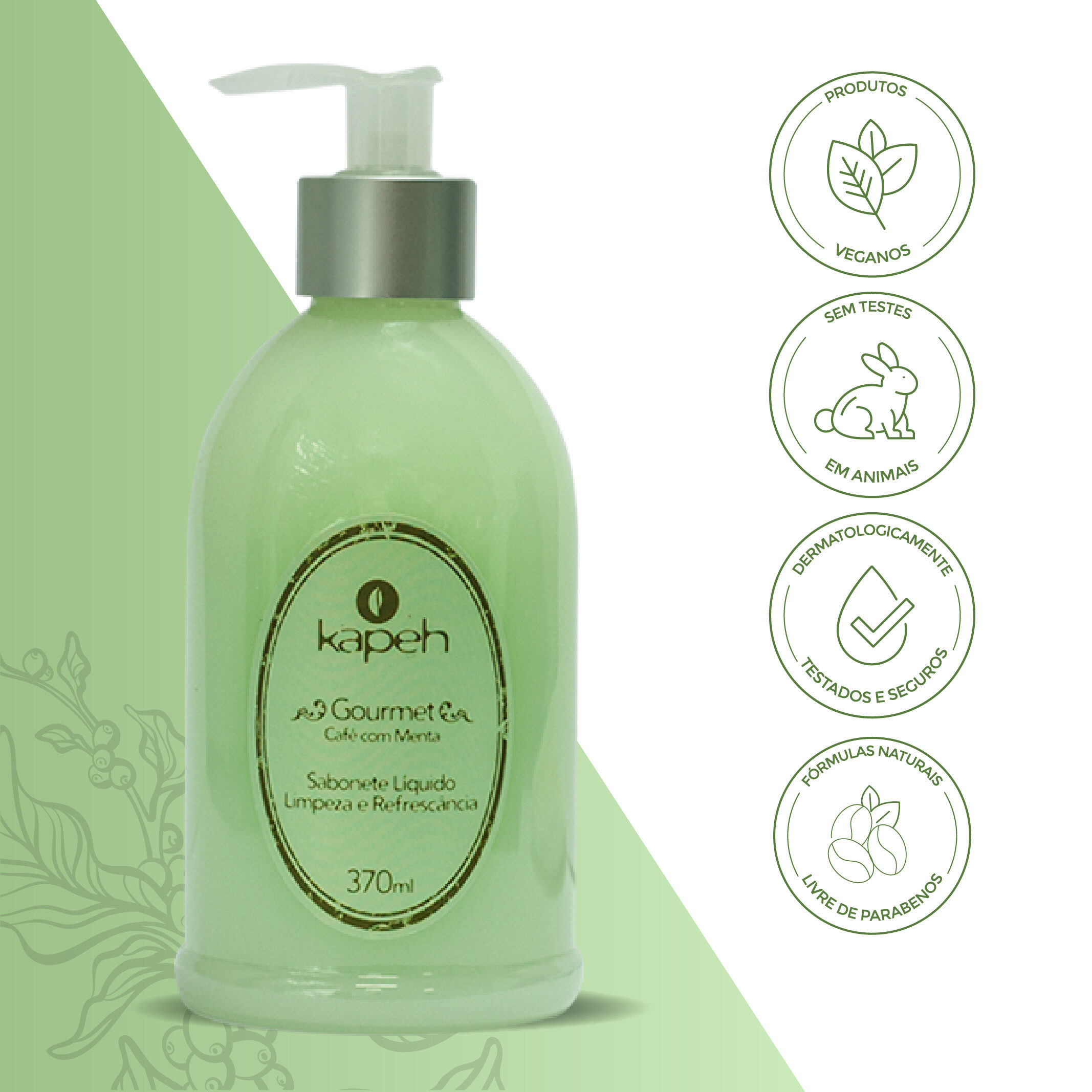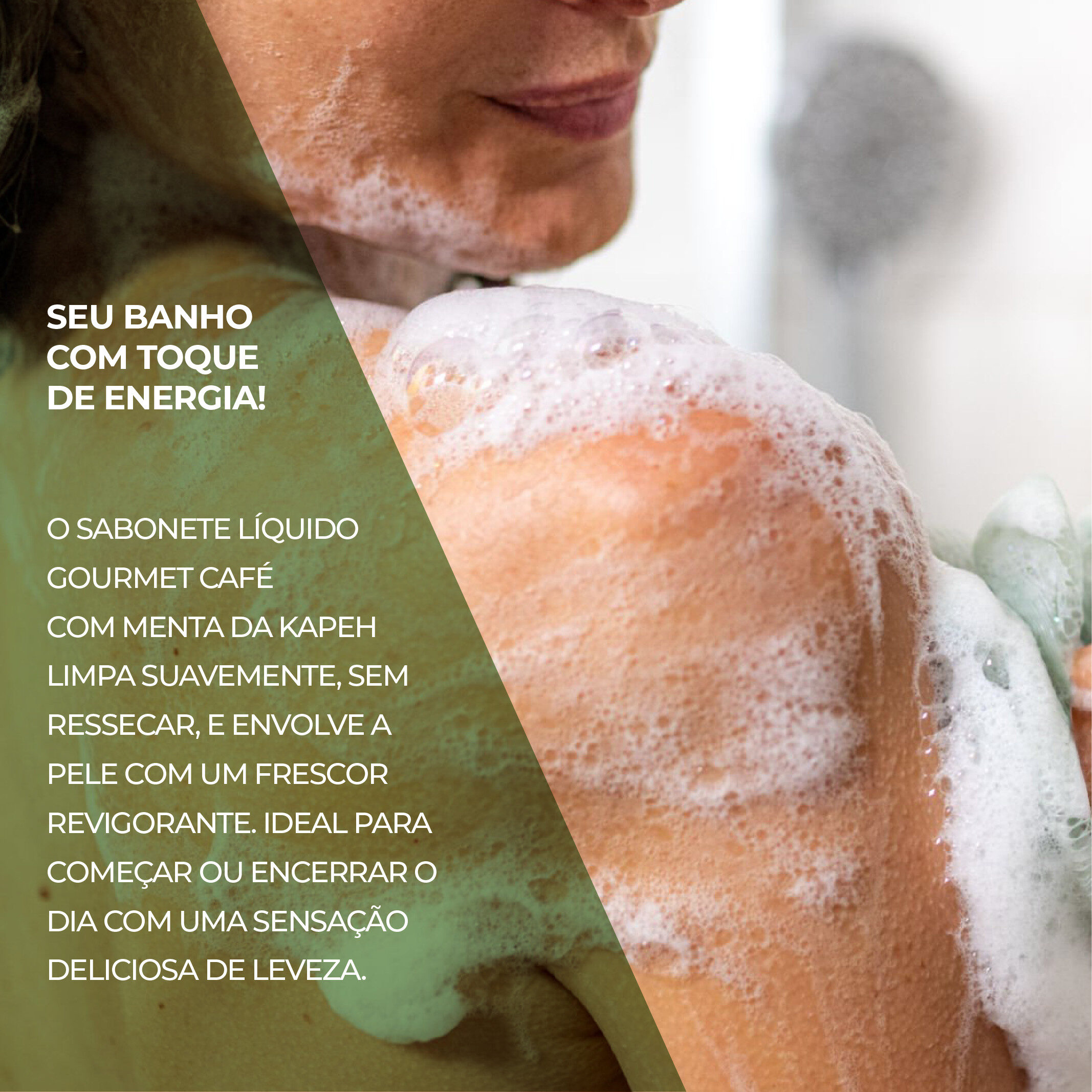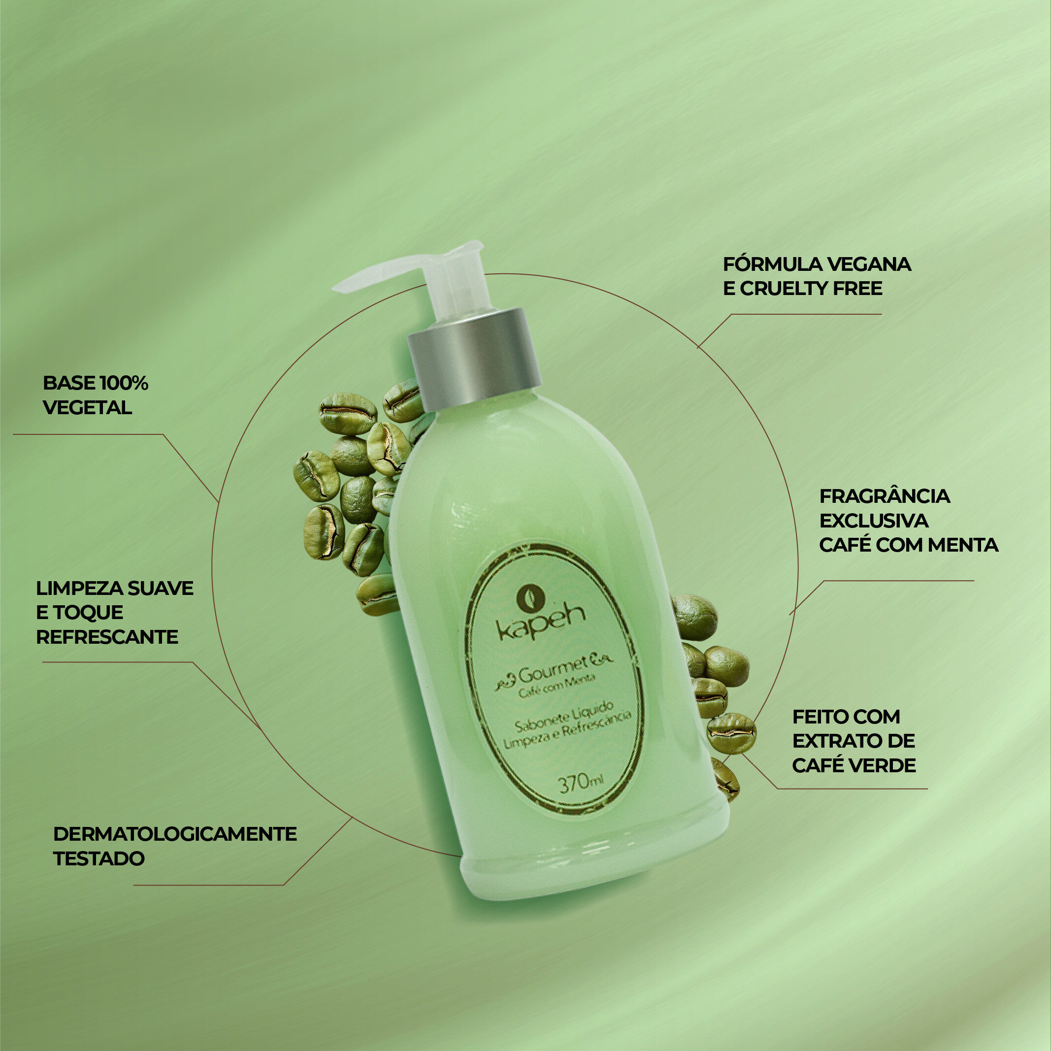 O Sabonete Líquido Café com Menta Kapeh possui fórmula feita à base de Extrato de Café Verde e enriquecida com Mentol e fragrância aromática inspirada na combinação do café com a menta, que proporcionam sensação de frescor e bem-estar.