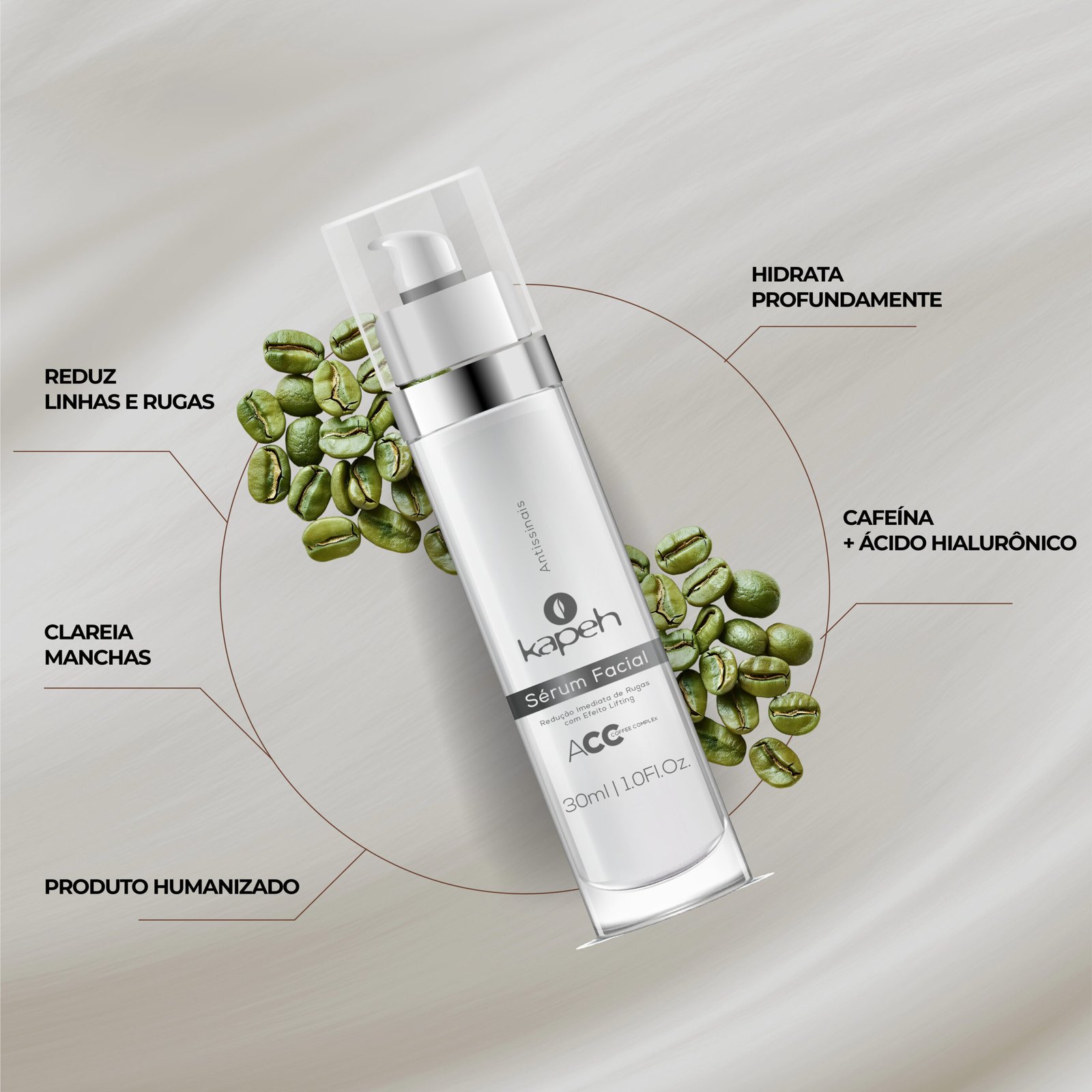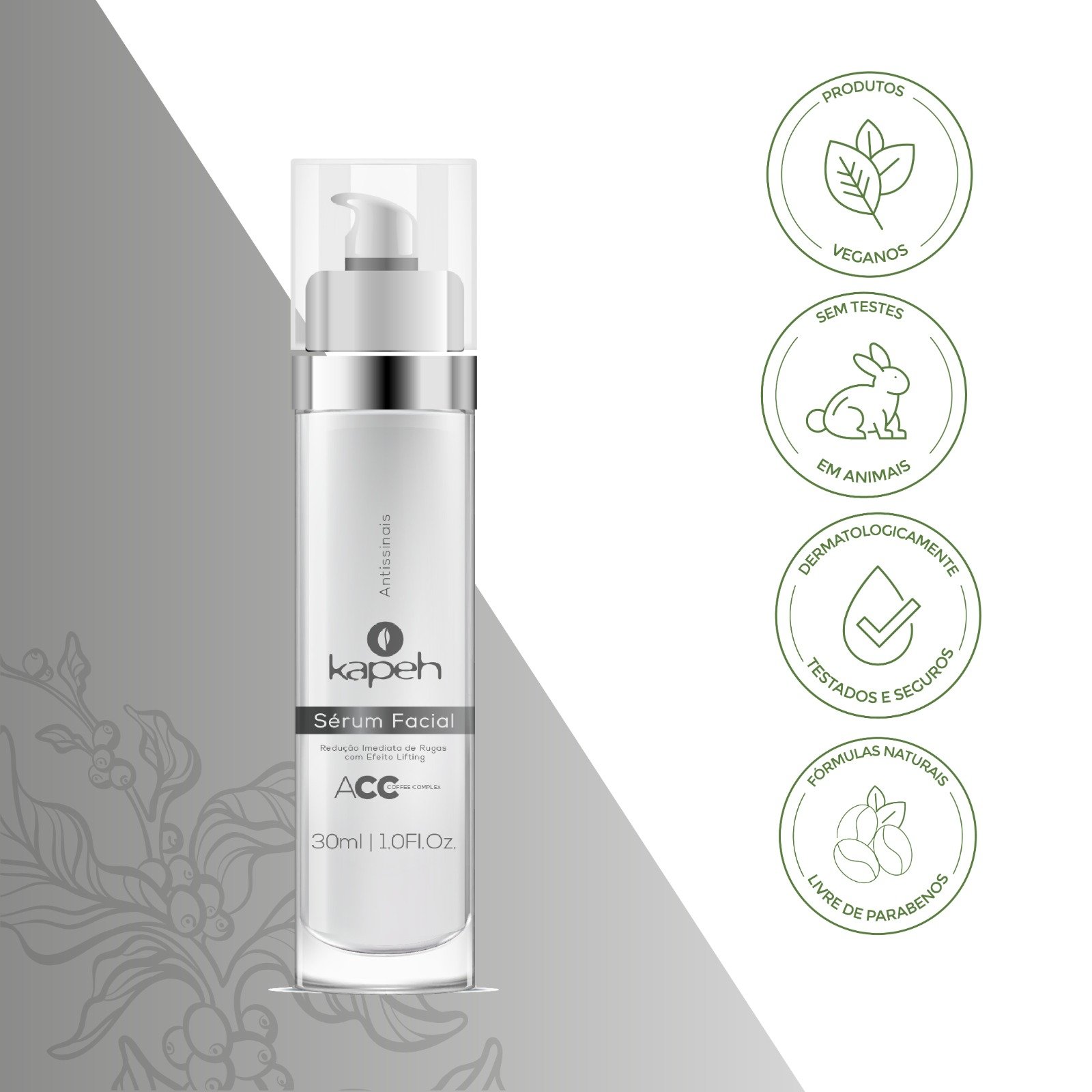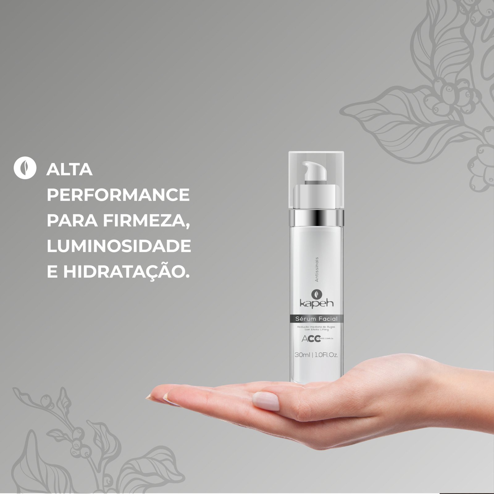 | Informações | O Sérum Facial Antissinais Kapeh possui fórmula super concentrada feita com a exclusiva tecnologia ACC Coffee Complex, poderoso ativo antioxidante do Café, combinada à Argirelina, Alantoína e outros ingredientes tecnológicos e naturais, que promovem efeito imediato na redução das rugas e linhas de expressão, aumenta a firmeza e reduz a flacidez, combate o aspecto de pele cansada, recuperando sua radiância e luminosidade. Deixa a pele visivelmente mais jovem, conferindo hidratação profunda e redução dos poros. Com textura agradável é rapidamente absorvido, sem deixar a pele oleosa. Indicado para todos os tipos de pele. |
